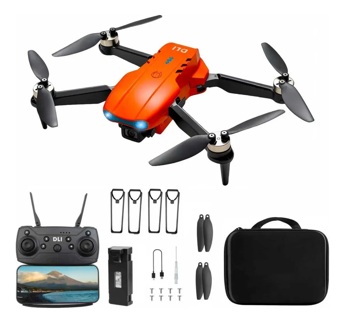 Principais recursos: câmera dupla 4K/6K, motor brushless, FPV Wi-Fi, fluxo óptico, evitação de obstáculos, 2 baterias 1.800 mAh, bolsa de transporte.
