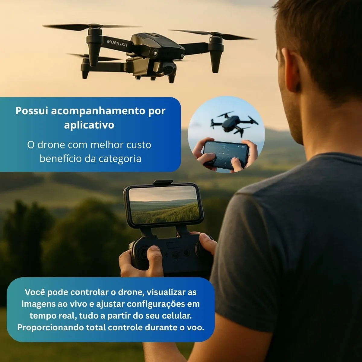 A visão FPV é um grande diferencial: você pilota vendo exatamente o que o drone vê, em tempo real pelo smartphone.